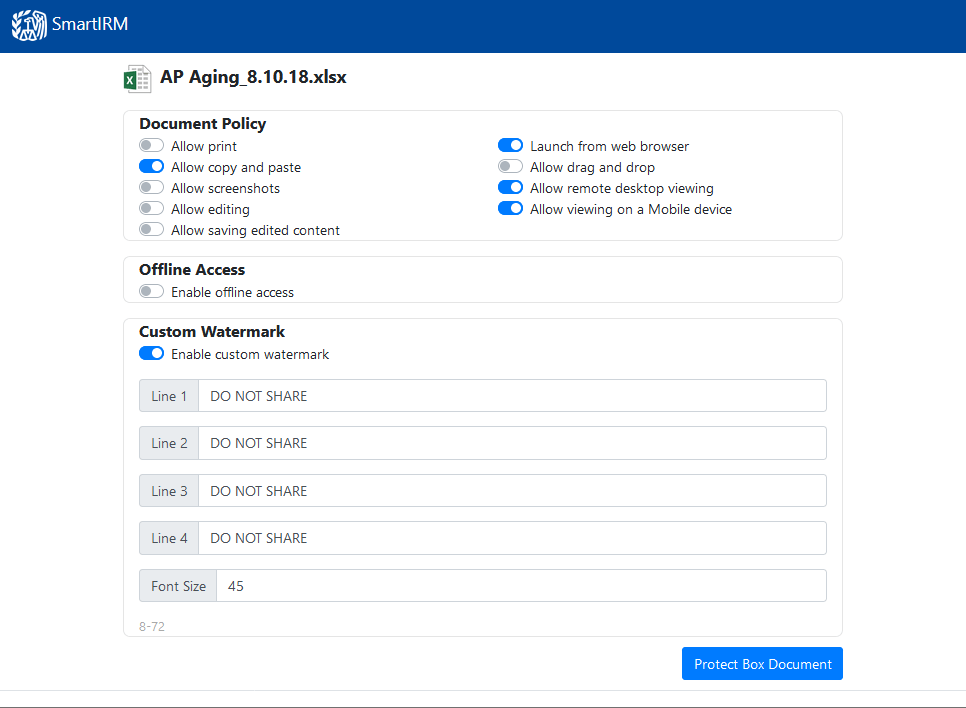SmartIRM is an information right’s management application that lets you control data, even after it has been shared with third parties. SmartIRM encrypts your files with custom security rules that allow or deny specific document activities such a printing, editing, screen capture or copy/paste. You can even remotely detonate documents at any time.